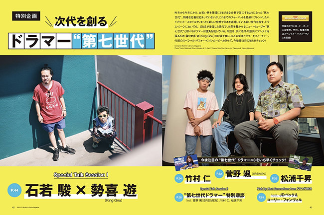 昨年から今年にかけて、お笑い界を筆頭にさまざまな分野で耳にするようになった"第七世代"というワード。明確な定義は定まっていないが、まったく新しい発想で日本を席巻している若い世代を指す。ドラム・シーンにおいても世間を驚かせるニュー・ウェーブ="第七世代"と呼べるドラマーが頭角を現している。今回の特別企画では共に若手の動向にアンテナを張る石若 駿×勢喜 遊[King Gnu]のスペシャル対談を軸に、菅野颯[BREIMEN]、竹村仁、松浦千昇という3人の新進ドラマーをフィーチャー。付録のDLカードからは、次代を担う彼らのスペシャル・パフォーマンス映像がダウンロードできます!