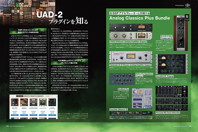 高品位なアウトボードが欲しいけれど手が届かない......そんな方にお勧めしたいのがUNIVERSAL AUDIOのUAD-2プラグイン。先代のUAD-1から約20年、再現度の高さを多くのアーティストやエンジニアが支持している。普段聴いてきた音楽にも、きっとUAD-2プラグインが使われていたはずだ。UAD-2に触れたことの無い人からヘビー・ユーザーまで有益となるよう、インターナショナル・セールス・マネージャーにUAD-2の秘密を、達人9人に愛用するUAD-2プラグインとその使い方を聞き、約20ページにわたってUAD-2の魅力に迫った。