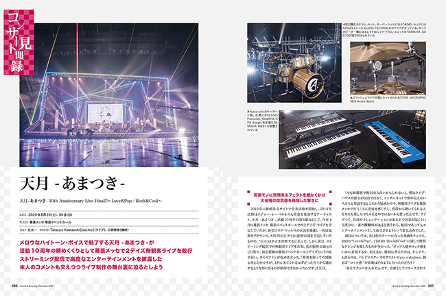 メロウなハイトーン・ボイスで魅了する天月 -あまつき-が、活動10周年の締めくくりとして幕張メッセで2デイズ無観客ライブを敢行! ストリーミング配信で高度なエンターテインメントを披露した。本人のコメントも交えつつ、ライブ・アレンジ/音響/カメラ/配信の面からライブ制作の舞台裏に迫るとしよう。