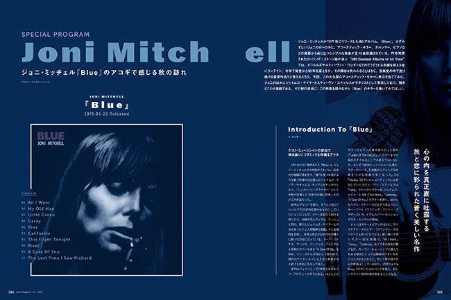 ジョニ・ミッチェルが1971年にリリースした4thアルバム、『Blue』。みずみずしいジョニのボーカルと、アコースティック・ギター、ダルシマー、ピアノなどの楽器から成り立つシンプルな楽曲が全10曲収録されている。昨年発表されたローリング・ストーン誌が選ぶ"500 Greatest Albums of All Time"では、ビートルズやスティーヴィー・ワンダーなどのそうそうたる名盤を抑え3位にランクイン。今年で発売から50年を迎えるが、その輝きは失われることはなく、音楽史の中で光り続ける重要作品と言えるだろう。今回、この大名盤のアコースティック・ギターに焦点を当ててみた。ジョニのほかにジェイムス・テイラーとスティーヴン・スティルスがギタリストとして参加しており、聴きどころが満載である。ぜひ秋の夜長に、この特集を読みながら『Blue』のギターを聴いてみてほしい。