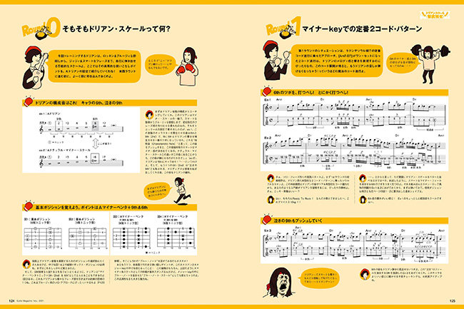 今月の奏法企画は、ジャズやブルースのほか、ロックでも汎用性の高い"ドリアン・スケール"。メジャーやマイナー、ペンタを使ったアドリブはできるけど、ドリアンなどのモードには実践的な理解がないという方も多いのでは? そんなギター弾きを代表して新人ニッキーが立ち上がり、伝説のドリアン・トレーナー"Aドリアン"に教えを乞うことに。お洒落に弾きこなすための5つのシチュエーション別メニューやデイリー・エクササイズまで、徹底的に仕込んでくれるぞ。果たしてニッキーは、Aドリアンの鬼トレーニングですべてのラウンドを勝ち抜くことができるのか!?