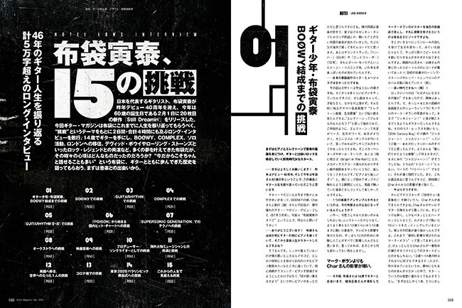 ここでは、布袋寅泰に縁のある国内ギタリストが登場! 日本の音楽シーンをともに牽引してきた盟友たちがアンケート形式で布袋へのメッセージを答えてくれた。