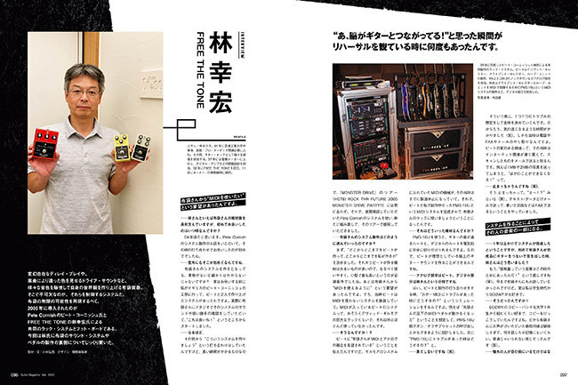 変幻自在なディレイ・プレイや、楽曲により違った色を見せるドライブ・サウンドなど、様々な音色を駆使して自身の世界観を作り上げる布袋寅泰。そこで不可欠なのが、それらを制御するシステムだ。布袋の無限の可能性を再現するべく、2005年に導入されたのがPete Cornishのピート・コーニッシュ氏とFREE THE TONEの林幸宏氏による共同のラック・システムとフット・ボードである。今回は林氏に布袋のサウンド・システムやペダルの製作の裏側についてじっくり聞いた。