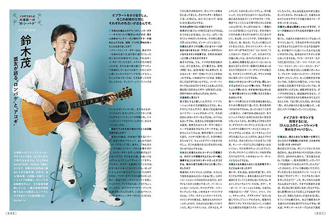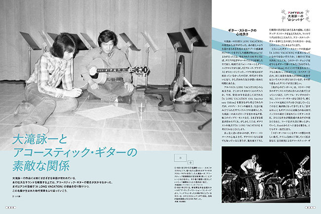 1981年3月21日に発売された大滝詠一の大名盤『A LONG VACATION』。通称"ロンバケ"。日本ポップス史の金字塔と言えるこの作品は、2020年時点で200万枚以上のセールスを記録し、発売後40年を経た今も色褪せることなく、聴けば聴くほどに新たな発見をもたらしてくれます。アレンジの妙やレコーディング技術で語られることも多い同作ですが、何より際立つのは楽曲そのものの素晴らしさ。アコギ弾きならずとも、つい口ずさみたくなるような美しいメロディに溢れており、爽やかな風が心の中を通り抜けていきます。本作には約20名にも及ぶ当時の一流スタジオ・ミュージシャンたちがクレジットされていますが、その中において吉川忠英、安田裕美、笛吹利明といったアコースティック・ギターの名手が素晴らしい仕事をしていることはあまり語られていません。本特集では、ナイアガラ・サウンドの肝と言えるアコギ・サウンドに迫ると同時に、大滝流コード進行の分析や「君は天然色」のソロ・ギター・アレンジ譜なども用意。さらには、おまけとして大滝詠一作曲だらけのコード・ダイアグラム付き歌本(全13曲)も付録。ぜひアコースティック・ギターを片手に、本特集を楽しんでください。