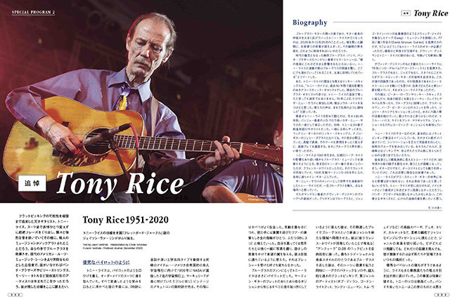 フラットピッキングの可能性を極限まで追求した天才ギタリスト、トニー・ライスの追悼記事。2020年12月25日に逝去したブルーグラスの巨人の軌跡を追い、彼が残した功績をたたえる。直接氏からギターを学んだ経験を持つパンチ・ブラザーズのクリス・エルドリッジが、トニー・ライス流儀のフラットピッキング奏法をYouTube動画連動でレクチャー! この貴重な奏法分析記事を中心に、"アンティーク"と呼ばれた1935年製マーティンD-28のギター・グラフやディスコグラフィーなどから、その魅力を深掘りする。