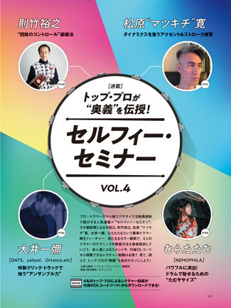 プロ・ドラマーのマル秘エクササイズを動画連動で紹介する連載="セルフィー・セミナー"。その第四弾となる今回は、則竹裕之、松原"マツキチ"寛、大井一彌、むらたたむという豪華ドラマー陣をフィーチャー。初となるカラー展開で、4人のドラマーの奏法や練習ポイントを徹底解剖していこう。本人達によるコメントや、付録DLコードから視聴できるレクチャー動画も必見!! 見て、読んで、トップ・プロのテクニックを自分のモノにしよう!