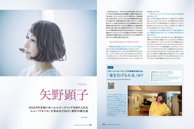 去る7月にデビュー・アルバム『JAPANESE GIRL』のリリースから45周年を迎えた矢野顕子。最新作『音楽はおくりもの』は、バンド・メンバーとして小原礼(b)、佐橋佳幸(g)、林立夫(ds)、メイン・エンジニアに飯尾芳史氏を迎えた10曲入りで、矢野が築き上げてきた"ポップ・ソング観"をストレートに感じさせるサウンドだ。日本国内のスタジオを拠点に制作されたが、アルバムの端緒となった楽曲「愛を告げる小鳥」に関しては、録音の大半がリモートで行われたという。矢野自身もAPPLE iPadやAVID Pro Toolsなどを使いホーム・レコーディングに臨んだそう。NYはマンハッタンの自宅でビデオ・チャット越しに答えてもらった。