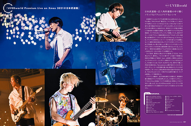 UVERworldは、圧倒的でストイックな音を届ける名バンドである。それは、ライブを目の当たりにしても、楽曲を聴いても感じられるところだ。彼らのカリスマ性やエモーショナルな歌詞、演奏力など、その魅力を多方向に分解して挙げるとキリがないが、サンレコは"UVERworldの最大の魅力はサウンドだ"と断言したい。今回は、クリスマスの日本武道館公演のレポートと、そしてTAKUYA∞と克哉に聞く最新アルバム『30』のインタビューという2本立てでお送りする。早速、彼らの音楽の発生源をのぞいていこう。