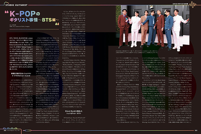 BTS、TWICE、BLACKPINK、aespaなどなど、今やアジア圏だけでなく世界を席巻しているK-POP。JYP EntertainmentのJ.Y. Park(パク・ジニョン)や、HYBEの"hitman"bang(パン・シヒョク)など、プロデューサーにクローズアップされることは多々あるが、カラフルな楽曲に色を付けるギタリストにスポットライトが当たることはほとんどなく、日本に住む私たちがその素性を知ることは難しい。そこで今回はBTSの楽曲制作やライブ・サポートに参加したスタジオ・ギタリストにフォーカスし、どのような人物がギターをプレイしているのかを探っていこう。