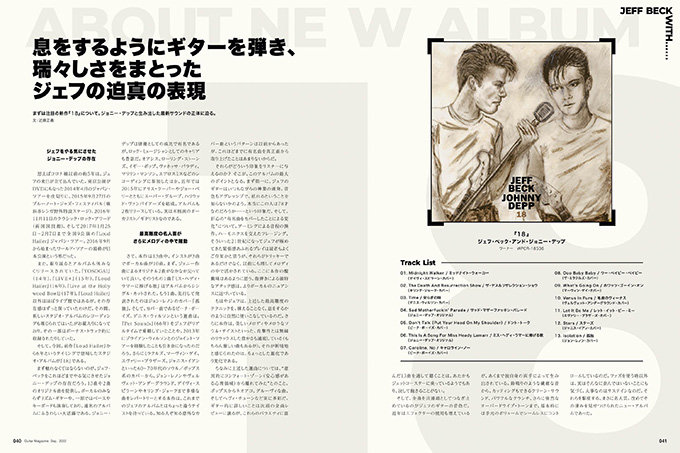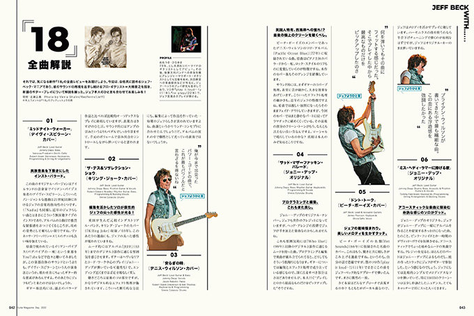 それでは、気になる新作『18』の全曲レビューをお届けしよう。今回は、自他共に認めるジェフ・ベック・マニアであり、彼のサウンドの再現を追求し続けるプロ・ギタリスト=大槻啓之を招き、新譜のギター・プレイについて解説を願った。ジェフ本人のひと言も合わせてお楽しみを!