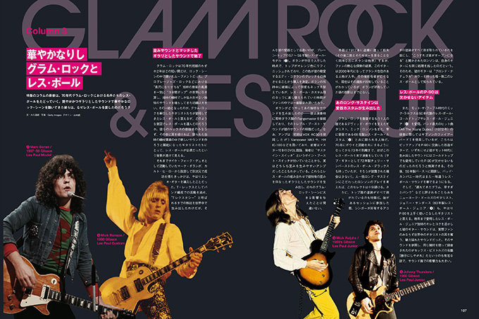 特集のコラムの最後は、70年代グラム・ロックにおける名手たちのレス・ポールをたどっていく。艶やかかつギラリとしたサウンドで華やかなロック・シーンを築いてきた彼らは、なぜレス・ポールを愛したのだろう?