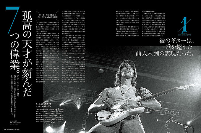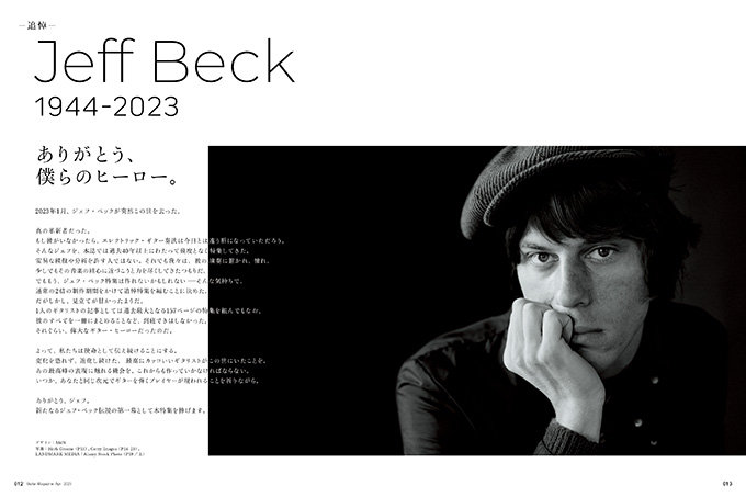 もし彼がいなかったら、エレクトリック・ギター奏法は今日とは違う形になっていただろう。そんなジェフを、本誌では過去40年以上にわたって幾度となく特集してきた。安易な模倣や分析を許す人ではない。それでも我々は、彼の演奏に惹かれ、憧れ、少しでもその音楽の核心に近づこうと力を尽くしてきたつもりだ。でももう、ジェフ・ベック特集は作れないかもしれないーーそんな気持ちで、通常の2倍の制作期間をかけて追悼特集を編むことに決めた。だがしかし、見立てが甘かったようだ。1人のギタリストの記事としては過去最大となる157ページの特集を組んでもなお、彼のすべてを一冊にまとめることなど、到底できはしなかった。それぐらい、偉大なギター・ヒーローだったのだ。