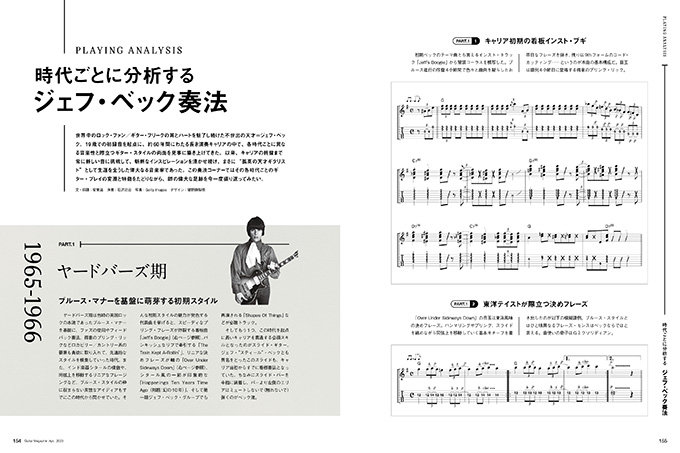 世界中のロック・ファン/ギター・フリークの耳とハートを魅了し続けた不世出の天才=ジェフ・ベック。19歳での初録音を起点に、約60年間にわたる長き演奏キャリアの中で、各時代ごとに異なる音楽性と際立つギター・スタイルの両面を見事に築き上げてきた。以来、キャリアの終盤まで常に新しい音に挑戦して、斬新なインスピレーションを湧かせ続け、まさに"孤高の天才ギタリスト"として生涯を全うした偉大なる音楽家であった。この奏法コーナーではその各時代ごとのギター・プレイの変遷と特徴をたどりながら、師の偉大な足跡を今一度振り返ってみたい。