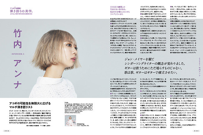 アコギ1本だけを抱えて、裸一貫でステージに立つ。ギターと歌だけで成立させる弾き語りという行為は、最も潔く、尊く、美しい表現方法だ。ステージでは誰の手も借りられず、信じられるのは己の力のみ......ある意味、音楽表現の原点と言っても過言ではないだろう。J-WAVEが主催する音楽フェス"GUITAR JAMBOREE"は、そんな弾き語りをテーマとした催しで、毎年錚々たる実力者たちが聖地・両国国技館に集結し、アコギ1本の勝負をくり広げている。今年の3月5日〜6日にかけて行なわれた"J-WAVE TOKYO GUITAR JAMBOREE 2022 supported by 奥村組"には、布袋寅泰や山崎まさよし、森山直太朗、竹原ピストルなど、総勢20組にも及ぶアーティストが出演。今回は、同イベントで使用された彼らのアコースティック・ギターの紹介に加え、出演者を代表して森山直太朗、山内総一郎、竹内アンナにインタビューを敢行。各々が持つアコギ弾き語りの美学に迫った。
