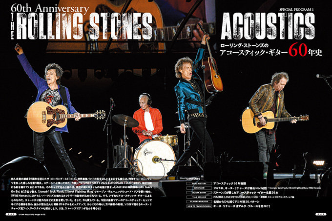 前人未到の結成60周年を迎えたザ・ローリング・ストーンズ。世界最強バンドの名をほしいままにする彼らは、昨年チャーリー・ワッツを失った悲しみを乗り越え、ステージへと帰ってきた。今夏に"STONES SIXTY 2022 EUROPEAN TOUR"を敢行、転がり続ける姿を観せてくれたのである。そのキャリアをふり返れば、現在に続くスタイルの地盤が固まったのは1960年代後半。「As Tears Go By」を12弦で書き、「Jumpin' Jack Flash」「Street Fighting Man」でオープン・チューニングのコード・リフを使い始め、「Wild Horses」にはグラム・パーソンズの魂たるカントリーの息吹が込められている。そう、いずれもアコースティック・ギターによるものなのだ。ストーンズは意外なほどに生音を愛していた。そして、今も愛している。今回は最新ツアーの使用機材を含め、彼らが惚れ込んだ銘器20モデルをピックアップ。さらにその鳴らし方や録音の真相、ソロ作で見せるキース・リチャーズ流フィンガースタイルも紹介しよう。さあ、ストーンズでアコギをかき鳴らせ!