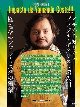 前号のアコースティック・ギター・マガジンでは、 "最高のソロ・ギタリスト100"というアンケート企画を実施。上位の結果は1位:トミー・エマニュエル、2位:押尾コータロー、3位:中川イサトという顔ぶれだったが、15位のヤマンドゥ・コスタを筆頭にブラジル出身のギタリストも数多くランクインした。実際、ブラジル音楽の世界は大変奥深く、とんでもないテクニックを持ったスーパー・ギタリストが大勢いる。今回はヤマンドゥのインタビューを軸に、ブラジル・ギタリストの系譜をイチからおさらい。本特集がこの世界へ足を踏み入れるきっかけになれば幸いだ。ブラジル出身のギタリスト、木村マルセロの直伝セミナーも必見!