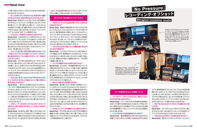 SKY-HI主宰のマネージメント/レーベル=BMSG所属のラッパーNovel Coreが、8月3日にアルバム『No Pressure』をリリース。その制作の裏側を、Novel Core単独インタビューに加え、楽曲制作を手掛けた複数のプロデューサー陣への取材を通してひもときます。Novel Coreの撮り下ろし写真やレコーディング風景、プロデューサーのスタジオ写真なども掲載。