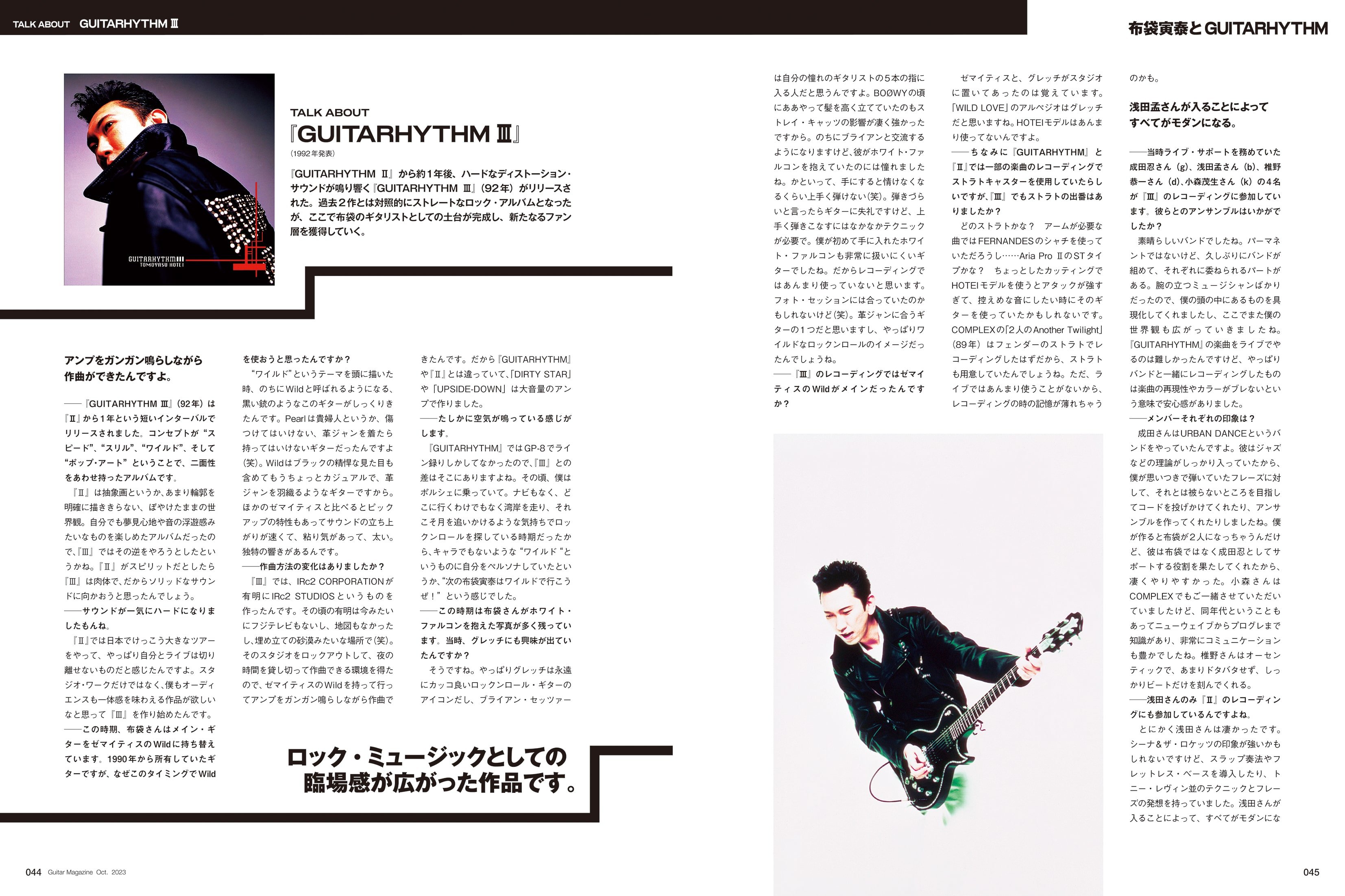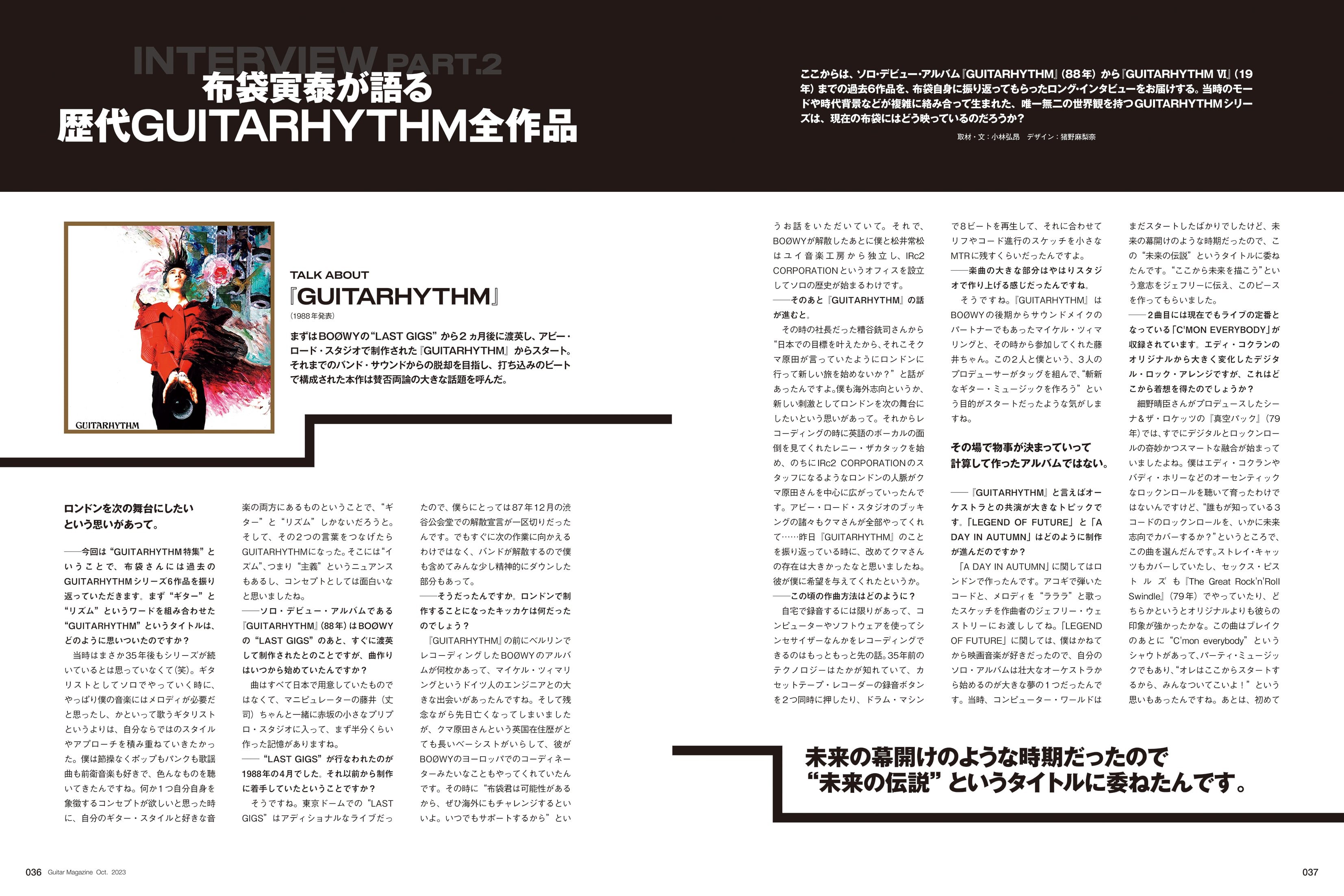 今から35年前の1988年、BOØWY解散後の布袋寅泰は、それまでの生の8ビートとは正反対の、デジタル・ビートとロックンロールを融合させたソロ・デビュー・アルバム『GUITARHYTHM』をリリースした。タイトルにもなっている"GUITARHYTHM(ギタリズム)"とは"ギター"と"リズム"をかけ合わせた造語だが、それはそのまま布袋を象徴するコンセプトとなり、その後『Ⅱ』~『Ⅵ』まで作られることになる。そして今回、4年ぶりとなるGUITARHYTHMの最新作『GUITARHYTHM Ⅶ』がリリースされた。この機会に、新作のことはもちろん、過去のGUITARHYTHMシリーズ6作品についても布袋に語ってもらったほか、レコーディングに参加したメンバーや布袋をリスペクトするギタリストへのインタビューを行なった"GUITARHYTHM大特集"を企画。改めて、GUITARHYTHMと共に歩んできた布袋の歴史を紐解いていこう。