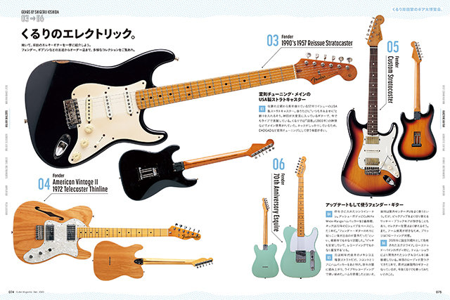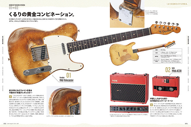 七色のサウンドを持つくるりの中で、これまた七色の表現で魅せるギター・サウンドこそがくるりの肝なのである。トリオ編成の原点回帰的な新作『感覚は道標』、およびその制作を追った『くるりのえいが』も、彼らがギター・バンドであることが改めて伝わる内容だった。くるりのギタリスト=岸田繁は、シンガー&ソングライターとしての側面に光が当たりがちだが、1人のギター弾きとしても確固たる存在感を持つ人物である。独自のコード・ワークによるバッキング然り、ロック・スピリット満載のリード・プレイ然り......。そんな岸田の演奏が、くるりをずっと躍動させ続けてきたのだ。そこで今回は、岸田とくるりのギターを徹底的に掘り下げる初の表紙巻頭特集をお届けする。シンガーでもソングライターでもなく、「ギタリスト=岸田繁」のみに焦点を当て、多方面から迫ってみよう。