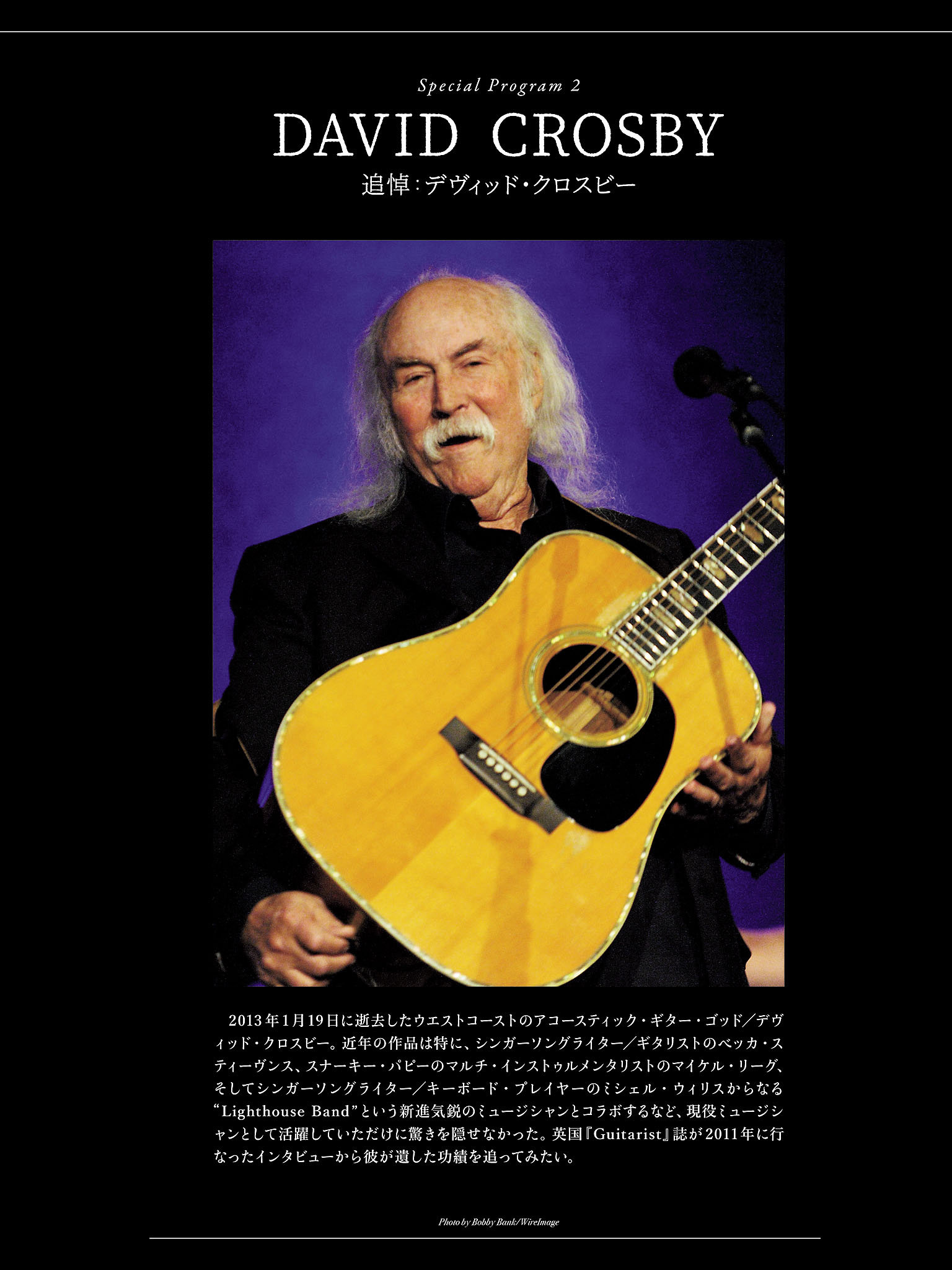 2013年1月19日に逝去したウエストコーストのアコースティック・ギター・ゴッド/デヴィッド・クロスビー。近年の作品は特に、シンガーソングライター/ギタリストのベッカ・スティーヴンス、スナーキー・パピーのマルチ・インストゥルメンタリストのマイケル・リーグ、そしてシンガーソングライター/キーボード・プレイヤーのミシェル・ウィリスからなる"Lighthouse Band"という新進気鋭のミュージシャンとコラボするなど、現役ミュージシャンとして活躍していただけに驚きを隠せなかった。英国『Guitarist』誌が 2021年に行なったインタビューから彼が遺した功績を追ってみたい。