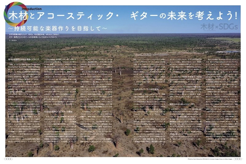 近年、話題のSDGs。持続可能な開発目標のことを指すが、おもに木材で製作されるギター業界でも、この取り組みに賛同するブランドがさまざまなアクションを起こしている。マーティンのハイプレッシャー・ラミネイト(端材を使った集積材)、テイラーのアーバンウッド(倒木材や区画整理で伐採された材)などがその代表例で、地産地消を目指して国産材の可能性に挑戦する国内メーカー、さまざまな企業とコラボレートする島村楽器主宰のEvergreen Project(売上の一部を植樹費用として寄付)などが存在している。今回はそんなSDGsなギターをテーマに、各ブランドの理念や試みを紹介。さらに、ギターとしてのポテンシャルを追求するべく、ジャズ・ギタリストの小沼ようすけによる本気の試奏を通し、その実力に迫る。