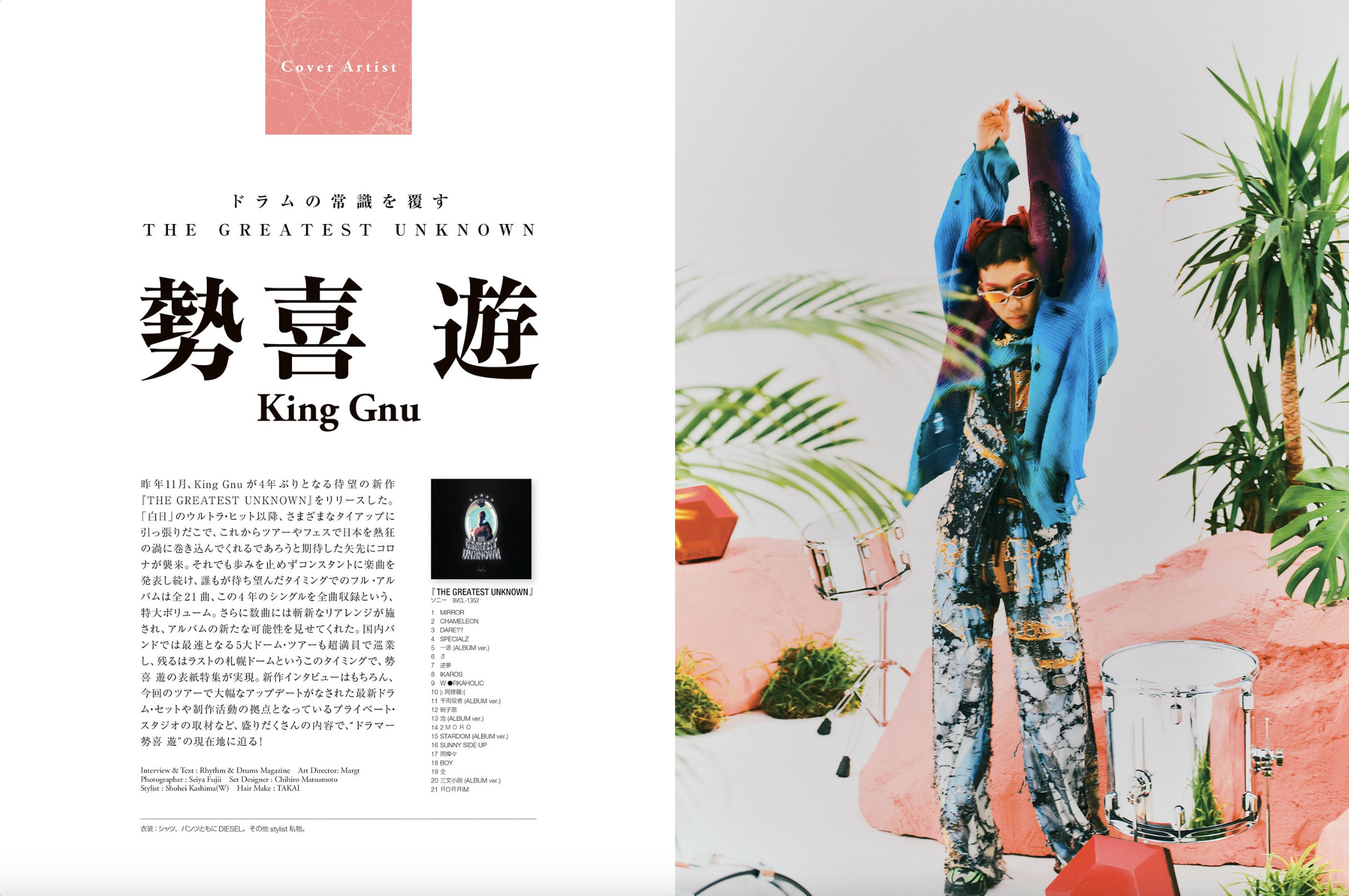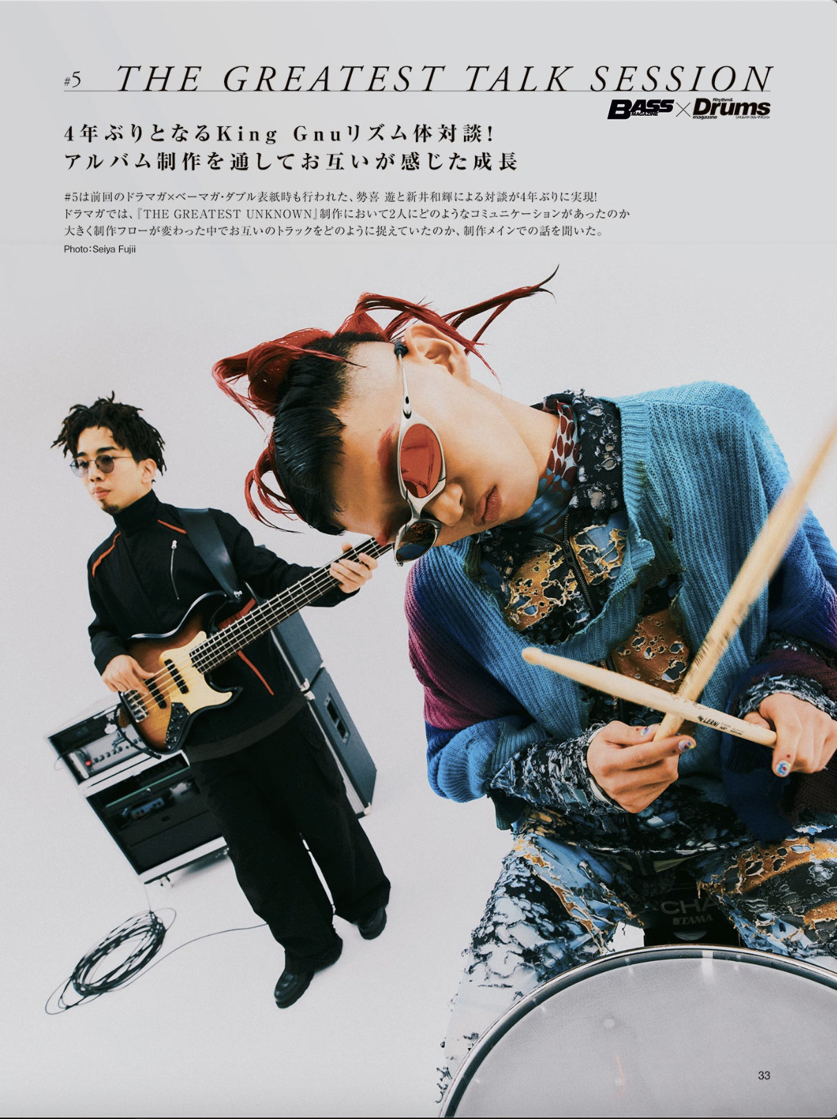 昨年11月、King Gnu が4 年ぶりとなる待望の新作『THE GREATEST UNKNOWN』をリリース。「白日」のウルトラ・ヒット以降、さまざまなタイアップに引っ張りだこで、これからツアーやフェスで日本を熱狂の渦に巻き込んでくれるであろうと期待した矢先にコロナが襲来。それでも歩みを止めずコンスタントに楽曲を発表し続け、誰もが待ち望んだタイミングでのフル・アルバムは全21曲で構成され、この4 年間で発表されたシングルを全曲収録。さらに数曲には斬新なリアレンジが施され、アルバムの新たな可能性を見せてくれた。国内バンドでは最速となる5大ドーム・ツアーも超満員で巡業し、残るはラストの札幌ドームというこのタイミングで、勢喜 遊の表紙特集が実現。新作インタビューはもちろん、今回のツアーで大幅なアップデートがなされた最新ドラム・セットや制作活動の拠点となっているプライベート・スタジオの取材など、盛りだくさんのコンテンツ! 計36ページの特大ボリュームで"ドラマー勢喜 遊" の現在地に迫る!