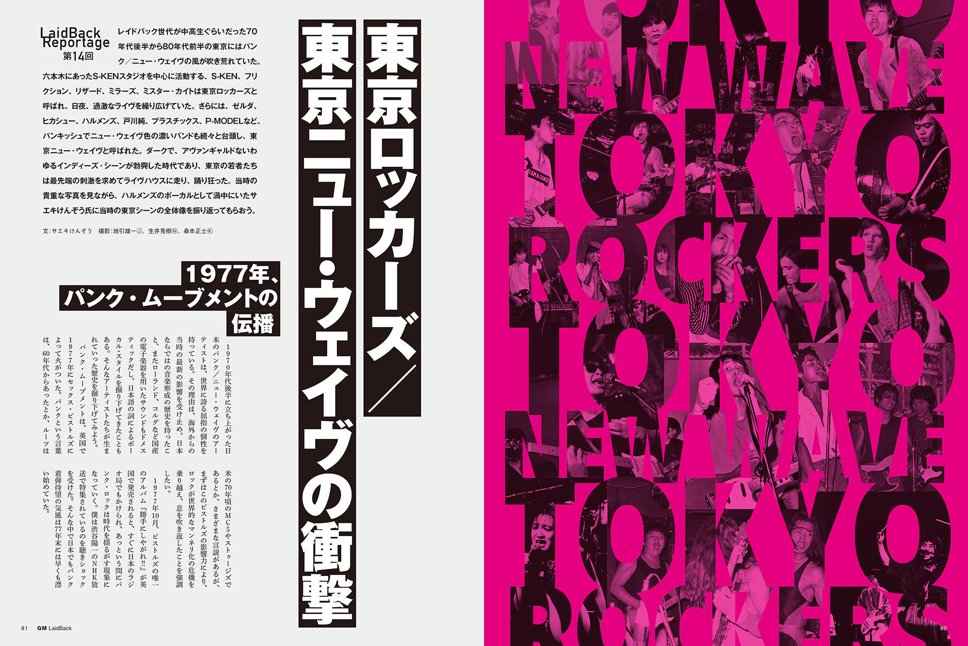 レイドバック世代が中高生ぐらいだった70年代後半から80年代前半の東京にはパンク/ニュー・ウェイブの風が吹き荒れていた。六本木にあったS-KENスタジオを中心に活動する、S-KEN、フリクション、リザード、ミラーズ、ミスター・カイトは東京ロッカーズと呼ばれ、日夜、過激なライブを繰り広げていた。さらには、ゼルダ、ヒカシュー、ハルメンズ、戸川純、プラスチックス、P-MODELなど、パンキッシュでニュー・ウェイブ色の濃いバンドも続々と台頭し、東京ニュー・ウェイブと呼ばれた。ダークで、アヴァンギャルドないわゆるインディーズ・シーンが勃興した時代であり、東京の若者たちは最先端の刺激を求めてライブハウスに走り、踊り狂った。当時の貴重な写真を見ながら、ハルメンズのボーカルとして渦中にいたサエキけんぞう氏に当時の東京シーンの全体像を振り返ってもらおう。