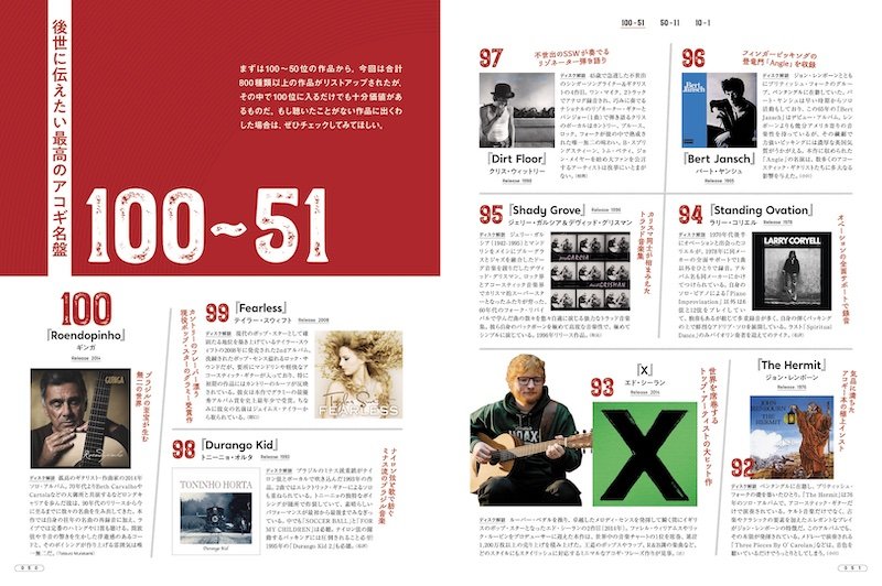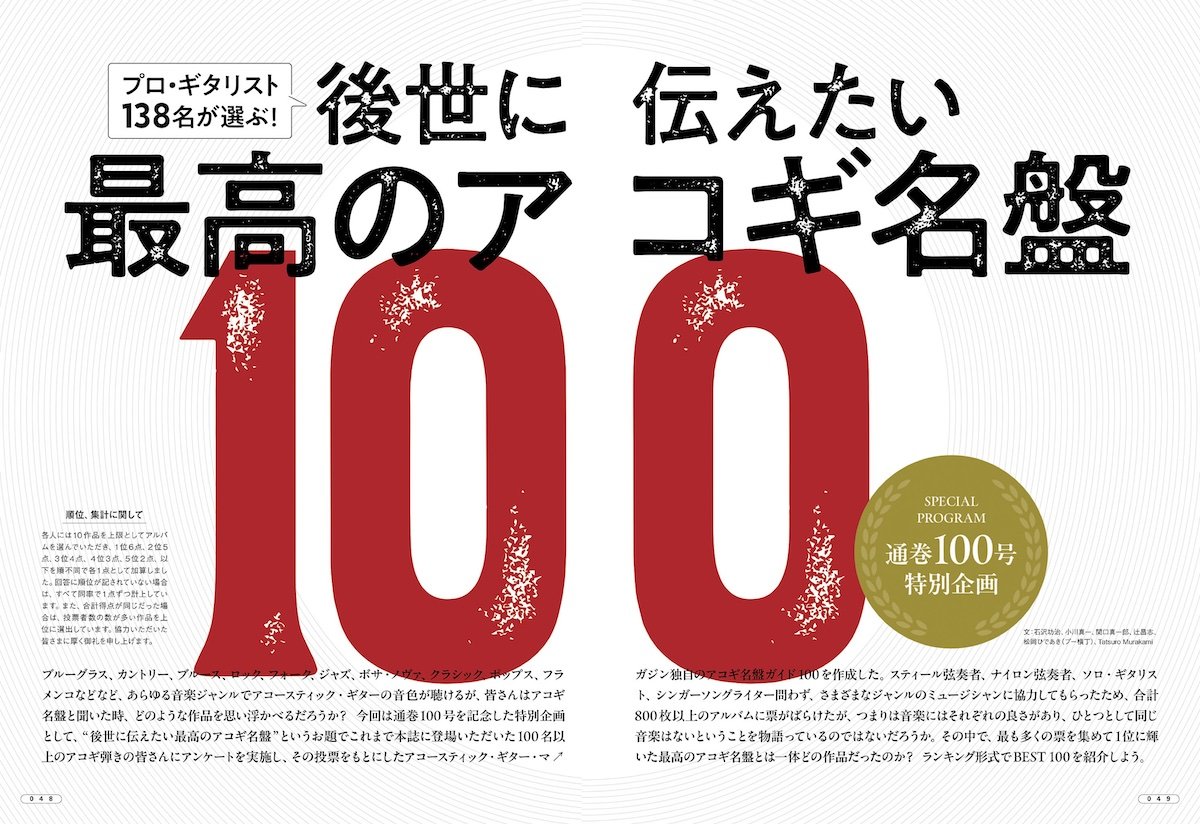 ブルーグラス、カントリー、ブルース、ロック、フォーク、ジャズ、ボサノヴァ、クラシック、ポップス、フラメンコなどなど、あらゆるジャンルでアコースティック・ギターの音色が聴けますが、皆さんはアコギ名盤と聞いた時、どのような作品を思い浮かべますか? 「後世に伝えたい最高のアコギ名盤」というお題で、これまで本誌に登場いただいた100名以上のアコギ弾きの皆さんにアンケートを実施し、その投票を元にしたアコースティック・ギター・マガジン独自のアコギ名盤ガイド100を作成。果たして1位に輝く最高のアコギ名盤とは?