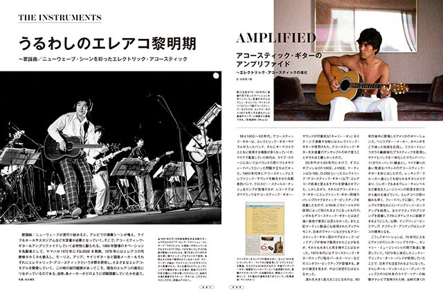 歌謡曲/ニューウェーブが流行り始めると、テレビでの演奏シーンが増え、ライブもホールやスタジアムなど大音量が必要となっていく。そこで、アコースティック・ギターもアンプリファイドしていく必然性に駆られる。1968年登場のオベーションを先駆者として、ヤマハが1972年にFG-350Eを発表、1978年にはエレアコの代表格タカミネも参入し、モーリス、アリア、ヤイリギターなど国産メーカーもそれぞれにエレクトリック・アコースティックという分野を研究し、さまざまなエレアコ・モデルを開発していく。この時の試行錯誤があってこそ、現在のエレアコの進化につながっているのである。当時、各メーカーがどのように切磋琢磨していたかを追う。