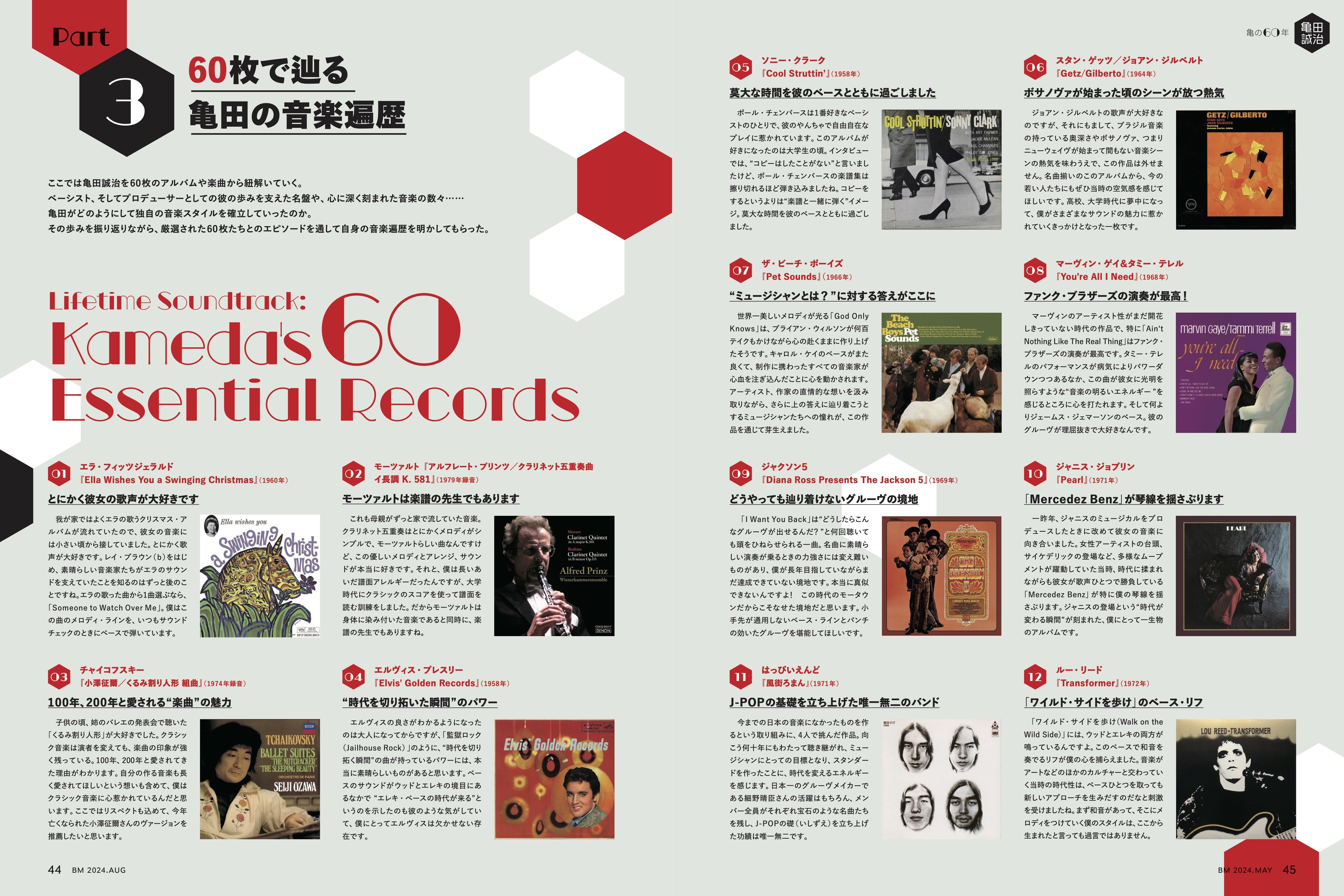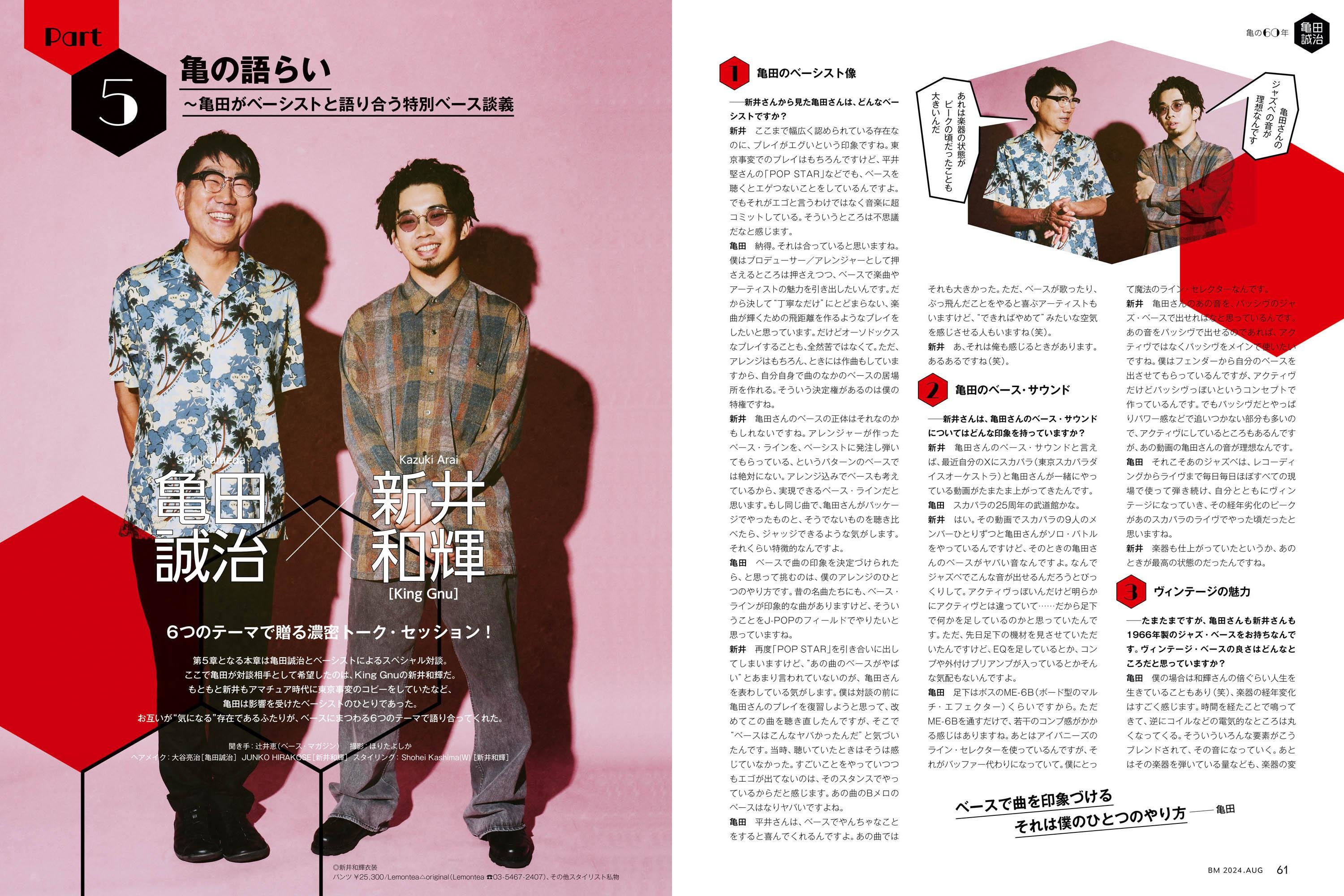 人生を振り返るロング・インタビューを始め、自身が影響を受けた作品紹介、自身を支える機材たち、亀田本人がベーシストに贈る金言&名言集、King Gnuの新井和輝との対談、親交のあるミュージシャンが語る亀田誠治の魅力など、さまざまなコンテンツで構成。大ボリュームで亀田誠治というミュージシャンを深堀りする。