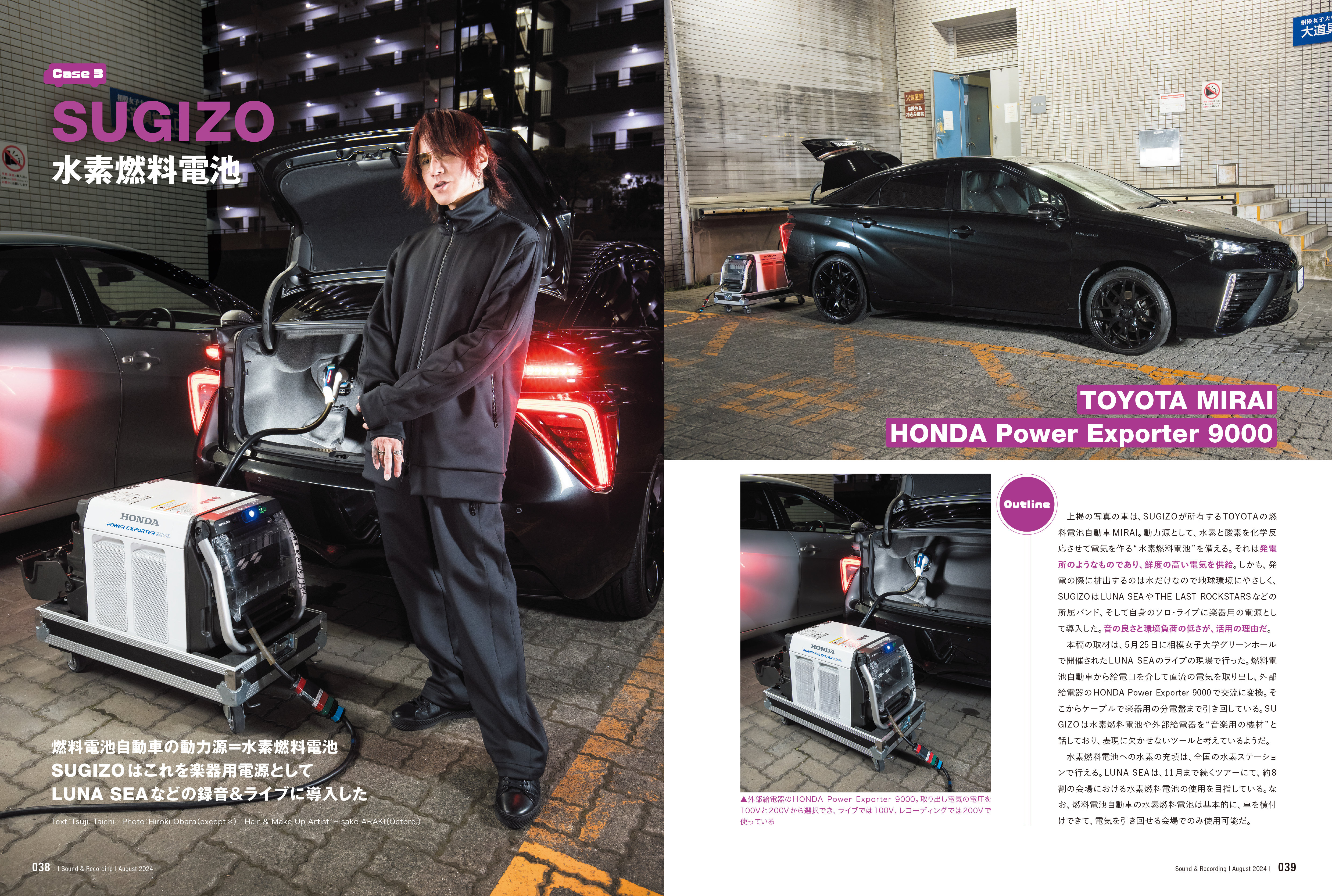 燃料電池自動車(FCV)のエネルギー源「水素燃料電池」を楽器用の電源として活用するSUGIZO。LUNA SEAのライブ現場を訪れ、使用シーンを撮影しつつ、SUGIZOとエンジニアの小松久明に取材しました。