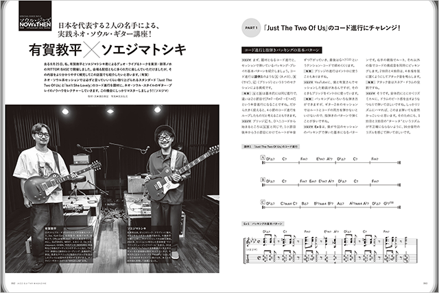 第2特集「ソウル・ジャズ NOW & THEN」では、デヴィッド・T.ウォーカーからネオ・ソウルまでの系譜を整理し、実践的な奏法を紹介。有賀教平&ソエジマトシキによるネオ・ソウル・スタイルの講座も掲載。