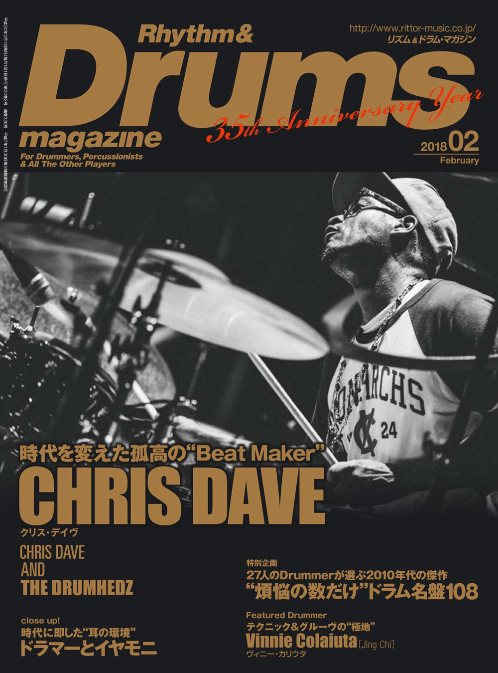 『リズム&ドラム・マガジン2018年2月』の表紙は、クリス・デイヴ! ロバート・グラスパー、ディアンジェロ、アデル、宇多田ヒカルなど、 数々のトップ・アーティストと共演する最高峰ドラマーを総力特集