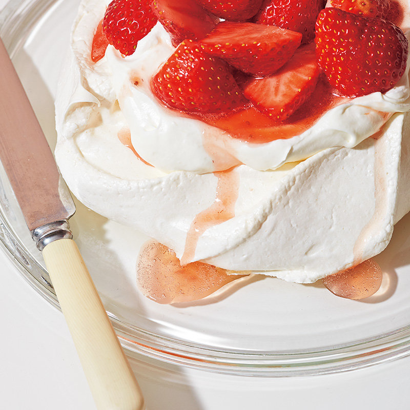 いちばんベーシックないちごのパブロバに、いちごソースを合わせて。フルーツソースは市販品でもよいですし、手作りをすれば、よりフレッシュな風味も味わえます。
