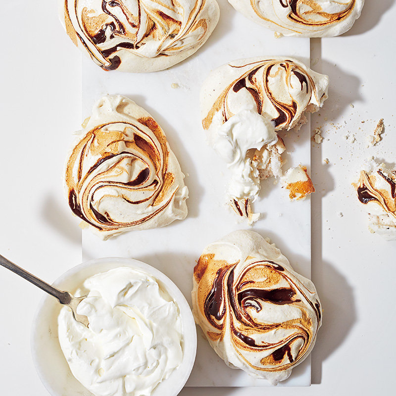 まっしろなパブロバにチョコレートソースと塩キャラメルソースでマーブル模様を描きました。ほろ苦さも加わった繊細な風味のパブロバ。