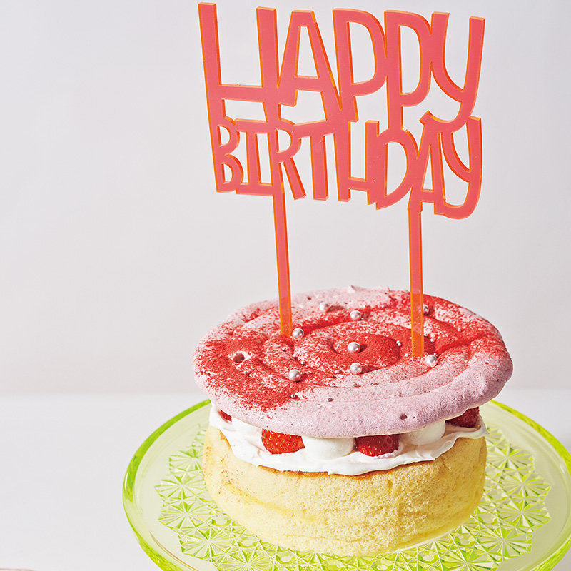 大切な人の誕生日にお祝いの気持ちを込めて。大切な人の誕生日にお祝いの気持ちを込めて。スポンジケーキをデコレーションするだけでなく、トップにパブロバをのせてストロベリーパウダーをふり、とびきりキュートに仕上げました。