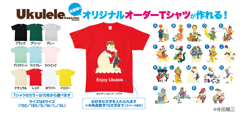 本フェアは、リットーミュージックが発行するフェア対象商品(ウクレレ関連書)を購入し、オビについている「応募券」を「はがき」に貼り付け応募すると、抽選で「ウクレレ・マガジンpresentsオリジナルオーダーTシャツ」が30名様に当たるというもの。ウクレレ・マガジンのバックナンバーの表紙を飾った動物イラスト(イラスト:寺田順三)のTシャツを、Tシャツのカラー(10色)やサイズ(6サイズ)を選べるのはもちろん、お好きな文字(15字まで)もプリントしてお届けします。世界に1枚しかない自分だけのオリジナルTシャツです。応募締切は2018年9月15日まで(https://www.rittor-music.co.jp/s/ukulele_fair/)。