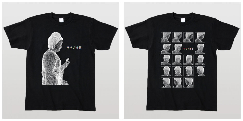 今回初となる公式Tシャツのデザインは、朝倉氏とテクノ法要のビジュアル・サポート・チーム「現代の仏師集団」プロジェクトとの共作によるもの。今年4月に開催されたニコニコ超会議2018「超テクノ法要×向源」のために作成された3D仏像(阿弥陀如来)がモチーフとなっています。