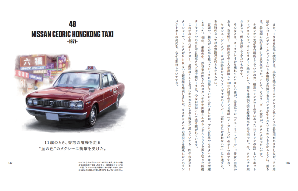本書は雑誌『POPEYE』に6年間にわたって掲載された人気コラムを書籍化したもので、FORD MUSTANG GT'65からCITROEN SMまで、70台を超える名車・旧車・ダメ車・珍車との思い出を横山剣が振り返ったカー・エッセイ集です。驚くべきはその記憶力で、車に目覚めた5歳当時の鮮烈な思い出から始まり、車のみならず音楽、映画、ファッション、レース、そして街や建物の記憶がめくるめくように溢れ出すさまは、当代一級のメモワールと言えるでしょう。そしてその背後に見え隠れするのは、キャンティ、ヤナセ、アルファレコードといった華やかな世界......。ただし、そんな昭和の潮騒に心を踊らせながらもノスタルジーに耽溺するわけではなく、21世紀の風景を疾走するのが横山剣流の「昭和ワープ」なのです。あべあつし氏による趣きのあるイラストレーションもすべてカラーで掲載し、仮想ドライブに華を添えています。