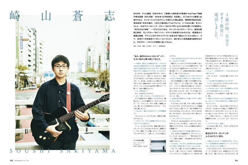 また第二特集として、国内トップ・ミュージシャンから絶大な支持を集めるブランドFREE THE TONEの記事を展開するほか、2018年末の紅白歌合戦でも記憶に新しい荒井由実「やさしさに包まれたなら」のギタースコア、話題沸騰中の16歳、崎山蒼志のインタビューなど、読みどころ満載の内容でお届けします。