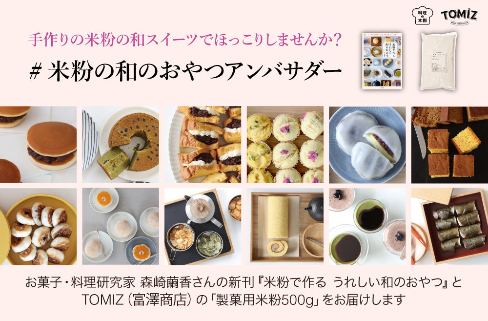 手土産にしたり家族に作りたてを味わってもらったり、ひと口食べれば笑顔が広がるうれしいおやつ「米粉の和のおやつ」。今回、米粉ファンの皆様に参加していただき「和のおやつ」のおいしさ、手軽さを広く宣伝したいと思っています。森崎繭香さんの著書『米粉で作る うれしい和のおやつ』のレシピを作って、インスタグラムに投稿してくださる50名のアンバサダーさんを大募集します。レシピブックで紹介されている「米粉の和のおやつ」をTOMIZの「製菓用米粉」を使って実際にお作りいただき、撮った写真をインスタグラムに投稿してください。活動期間は2019年3月1日から6月30日まで。