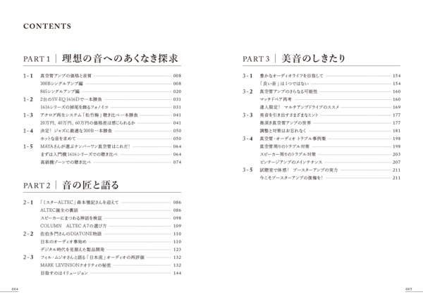 「真空管・オーディオ」シリーズ第3弾が登場! 大橋慎氏がパーソナリティを務めるミュージックバードの人気番組「真空管ワンダーランド」の内容を再構成した本書は、「タマ転がし」や「タマの聴き比べ」といったお楽しみはもちろん、近年人気の高まりを見せるアナログレコードの再生に関するトピックも多数収録。さらにはALTEC LANSING、DIATONE、MARK LEVINSONという重要ブランドに深いかかわりのあるレジェンド3名をゲストに迎えた熱いトークも掲載し、オーディオの世界を深く掘り下げています。まさに「探求編」と呼ぶにふさわしい内容で、読者をそれぞれの「理想の音への旅」に誘います。