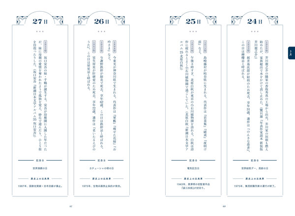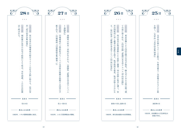 1月1日から12月31日まで、文豪たちがいつどこで何をしていたかがすぐわかる。まさに文豪の日めくりカレンダー!