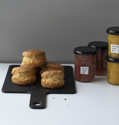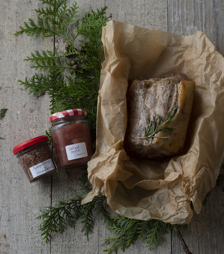 (上から)アペロの贈り物〜チーズサブレ2種(ブルーチーズサブレ・チェダー&カレーサブレ)、ティータイムの贈り物〜スコーンとジャム2種(スパイス風味のりんごジャム、パイナップルジンジャージャム)、クリスマスの贈り物〜ローストポークとラズベリーマスタード、朝ごはんの贈り物〜こねないパンとにんじんスープのもと