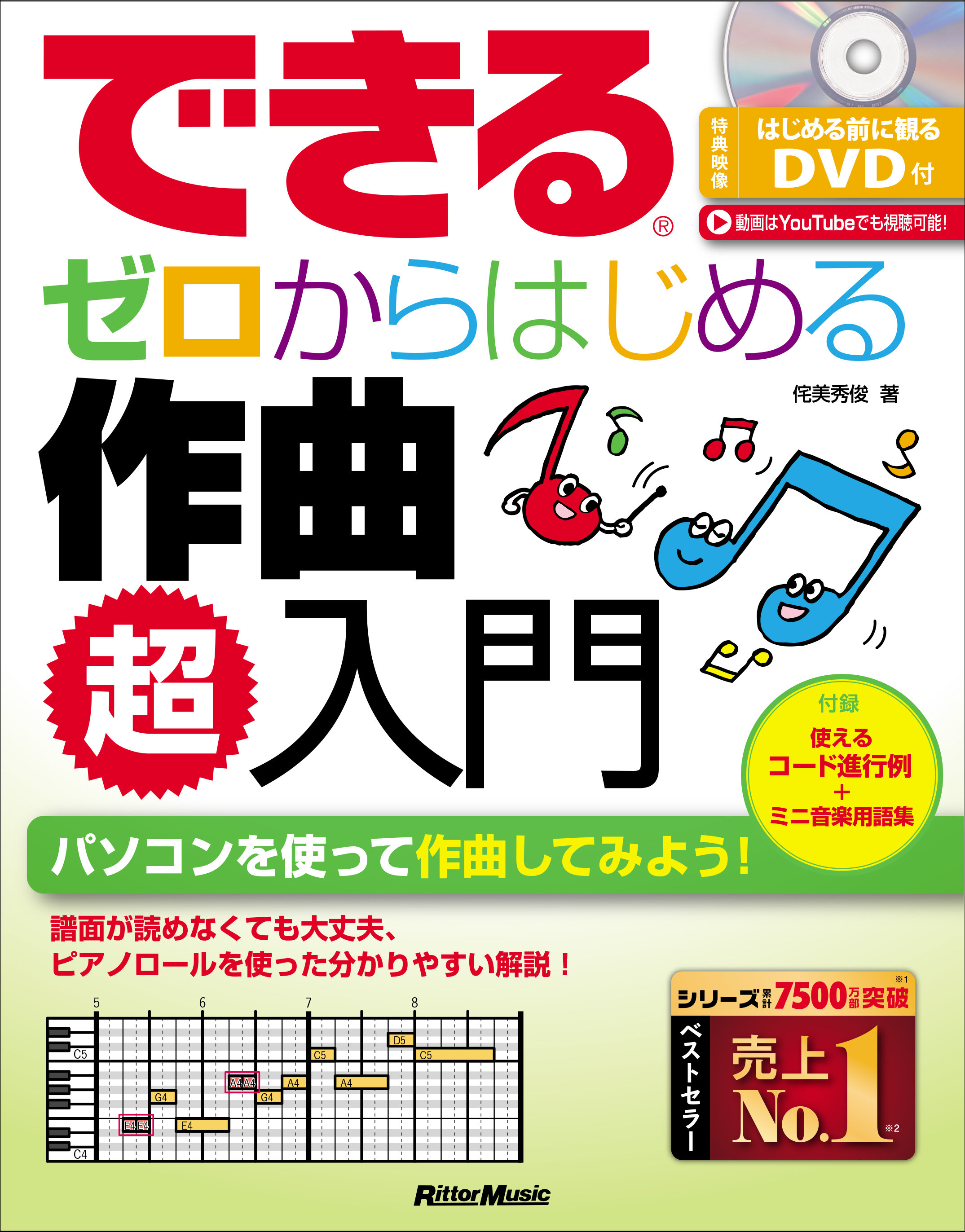 本書は『できる ゼロからはじめる楽譜&リズムの読み方 超入門』『できる ゼロからはじめる楽典 超入門』『できる ゼロからはじめるパソコン音楽制作超入門』などを執筆した著者が、パソコンを使った作曲のやり方をゼロから伝授していく画期的な1冊です。楽譜は一切使用せず、音の高さや長さをグラフィカルに表現したピアノロールを使って解説を進めていくので、譜面が読めなくても大丈夫。しかもDVDやYouTubeでの動画解説も用意されているので、それに従って作業を進めれば、知らず知らずのうちに曲作りの楽しさにハマってしまうこと請け合いです。