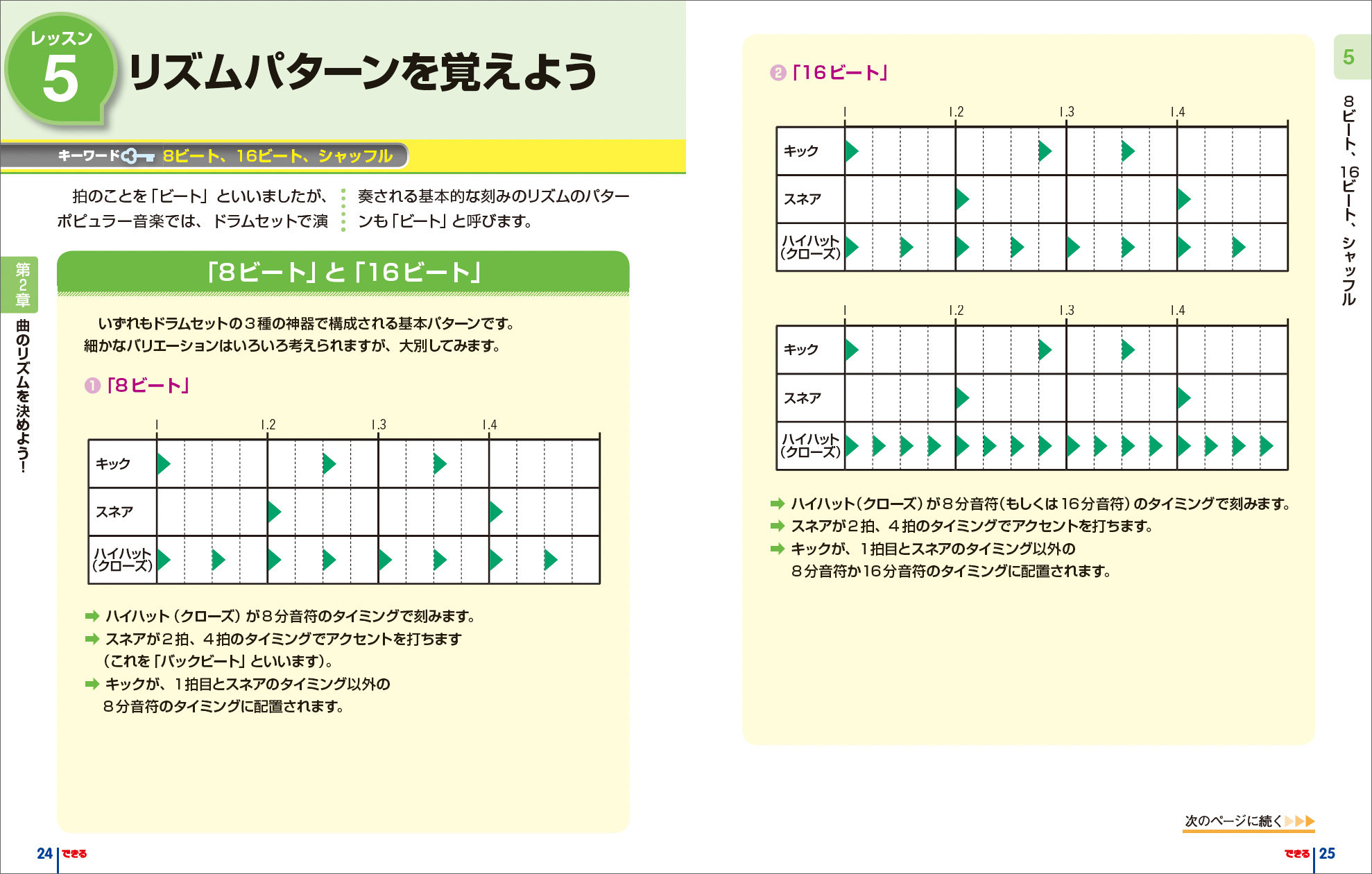 「第2章 曲のリズムを決めよう!」の「レッスン5 リズムパターンを覚えよう」より。メロディを考える土台となるリズムのパターンをご紹介