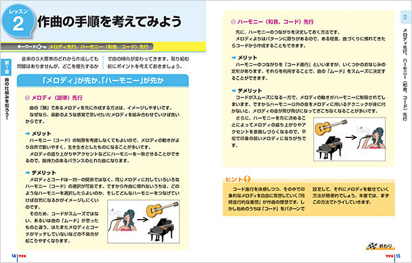 「第1章 曲の仕組みを知ろう!」の「レッスン2 作曲の手順を考えてみよう」より。メロディから考えるメリットとデメリット、ハーモニー(和音、コード)から考えるメリットとデメリット