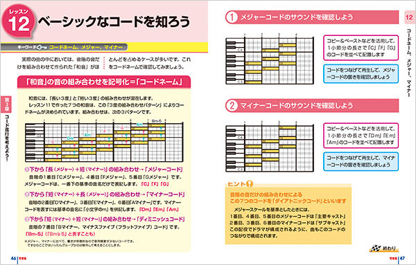 「第3章 コード進行を考えよう!」の「レッスン12 ベーシックなコードを知ろう」より。よく使われるコードを覚え、その組み合わせで曲を作っていきます