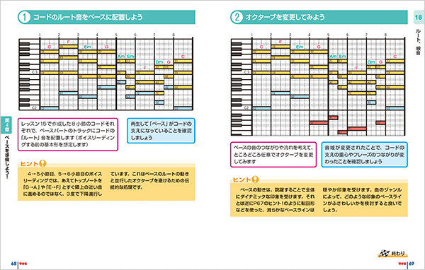 「第4章 ベースを準備しよう!」より「レッスン18 土台となるベースが弾く音を考えよう」実践部分。 コード進行にベースを配置していきます