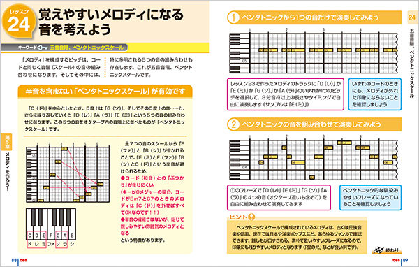 「第5章 メロディを作ろう!」の「レッスン24 覚えやすいメロディになる音を考えよう」より。本書ではある音階を使うことで失敗の少ないメロディづくりを伝授します